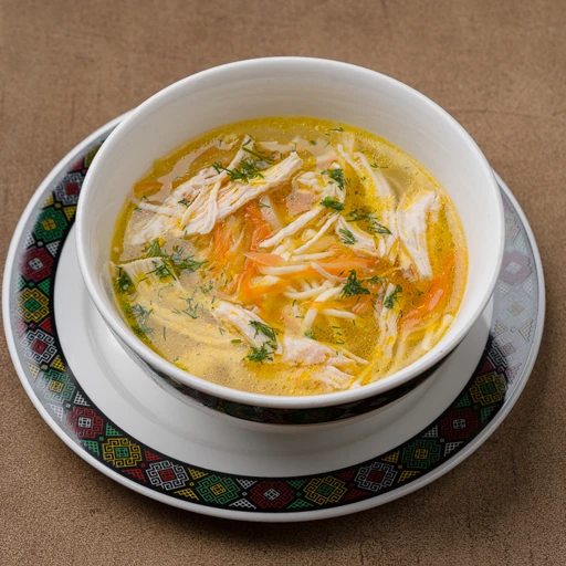 Суп из филе деревенского цыпленка с домашней лапшой и овощами. Подается со сметаной